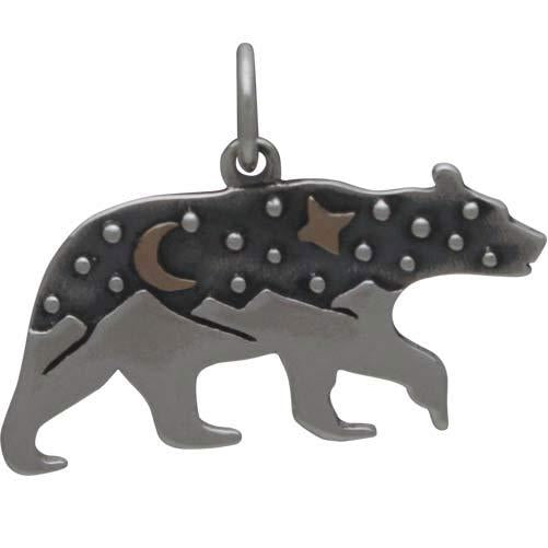 Silver Bear Charm with Mountains and Bronze Moon 16x22mm