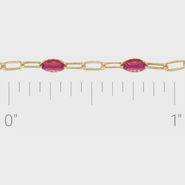 The Gold Filled Enamel Bead Paperclip-Style Chain is available in blue, green, pink, red, and multi-color.