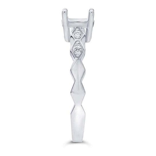 This 14-karat gold ring features a 4-prong mounting that holds one 6.5mm (1-ct., approx.) round faceted gemstone. The shank is set with eight .0067-ct. round diamonds (SI clarity/G, H color; .0536CTW), four on each side of the mounting. Cut a seat in the prongs to accommodate your stone, then burnish the prongs over the stone to secure it in place.