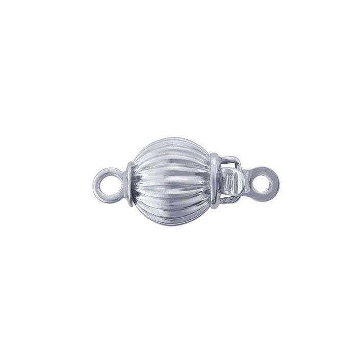 Keep necklaces and bracelets secure with this 14-karat yellow gold corrugated bead safety clasp. Featuring a smooth, bright finish that complements pearl or mixed-material strung designs, this clasp is a great choice for jewelry designs that need a little bit of added security. Safety clasps (also called pearl clasps) feature two parts that connect in two different ways, providing a fail-safe that helps prevent loss of higher-value necklaces or strands and are ideal for pearl and gemstone strands. The interior part of the clasp is a slender hook with notches along the outer edge; the exterior part is hollow except for a locking bar. The interior part hooks over the locking bar and then slides inside the exterior part, the notches catching along the inner sides to hold the clasp securely closed. Even if the notches fail for any reason, the hook keeps the strand in place.