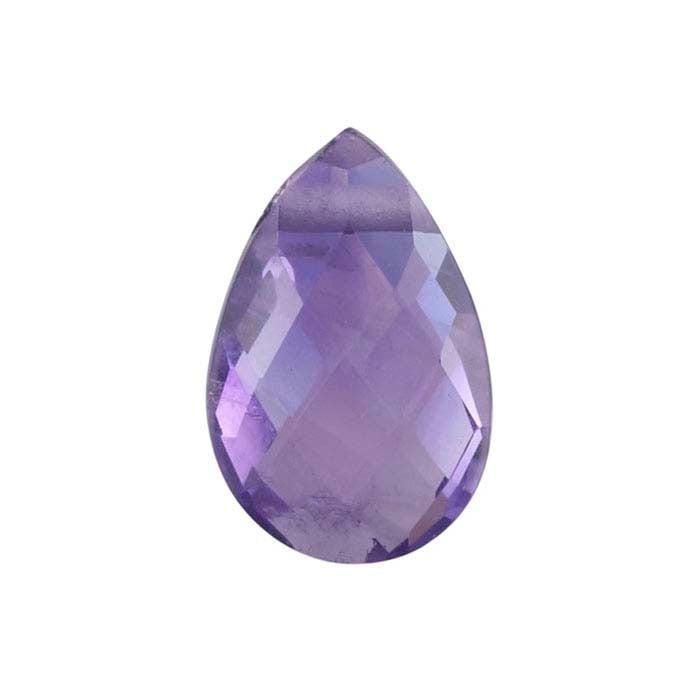 This pear-shaped amethyst briolette bead is features a flattened profile and is faceted around its entire surface, giving it an attractive light-catching quality that looks great when used for pendants, drops and earrings. String these beads with small metal beads or matching- or complementary-color stone beads between them to create a drop necklace or use them individually to create earring drop designs—if used to create a necklace, add small beads between the briolettes to ensure the strand lies flat.