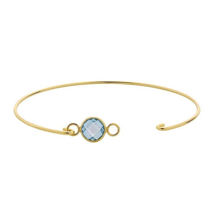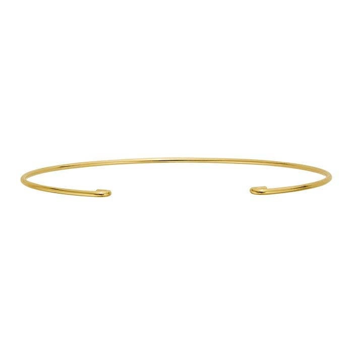 This 14/20 yellow gold-filled or 925 Sterling Silver bangle bracelet component features a hook on each end and is made from round wire. Design a custom plaque with a slot or jump ring on each end and attach it to the hooks on either end of the component to complete the bracelet. To permanently attach the component, simply pinch one of the hooks closed.