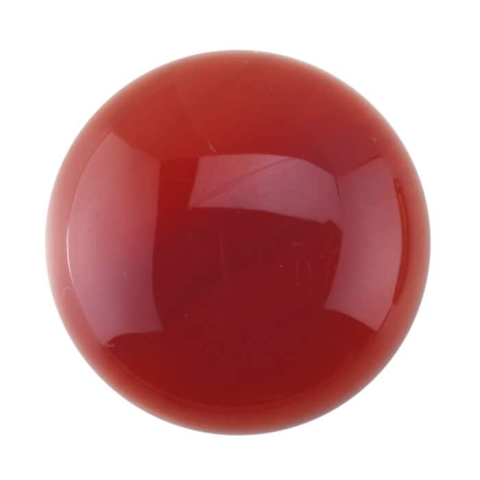 The dramatic, deep orange-red color of this round carnelian cabochon makes it a beautiful option for custom jewelry designs; the gemstone's relative hardness makes it a good substitute for other softer gems in pieces that will see wear, such as bracelets and rings. For an almost gothic look, match it with black onyx.