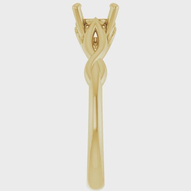This infinity design ring mounting is available in different setting sizes for your round gemstone. Choose yellow gold or white gold in the pull-down menu.