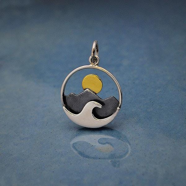 This sterling silver mountain and ocean charm with bronze sun will have nature lovers dreaming of that perfect day spent where ocean, mountains and the sunset meet. The artistry and beauty of this beachy scene expresses a love of nature when words fail.