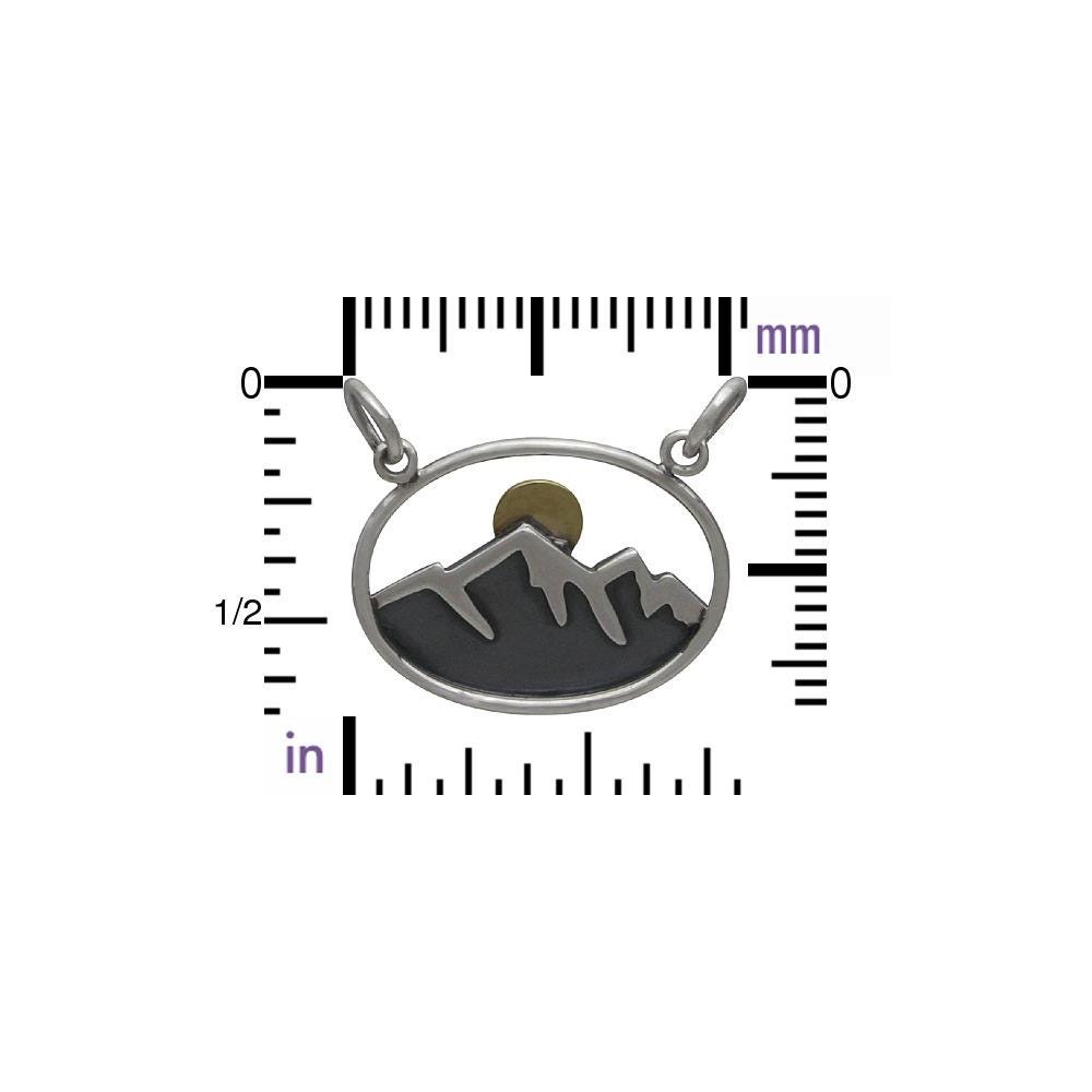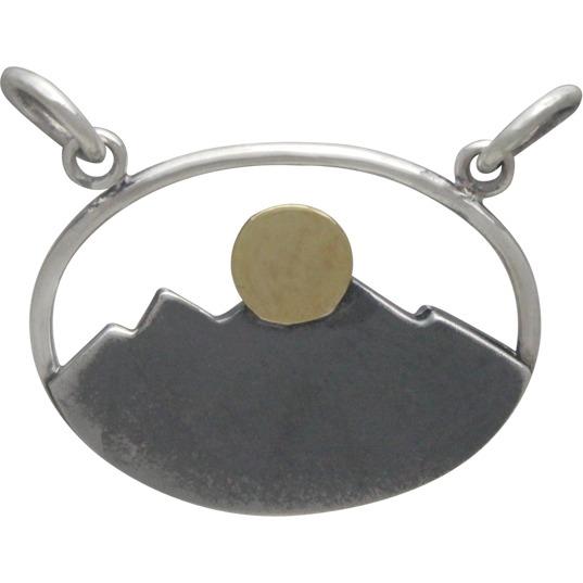 Sterling Silver Oval Mountain Pendant with Bronze Sun. This handmade, mixed metal pendant features an oxidized finish on the mountain range, sterling silver snow capped mountain tops and sweet little bronze sun rising and setting in the distance. Let this nature inspired piece remind you of your favorite place to vacation, exercise, or meditate. Oxidized detailing gives this cutout piece dimension. Whether you like to ski, hike, or go camping, this fun piece will help you remember that cool, fresh mountain air!