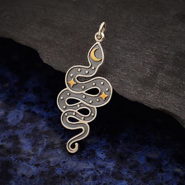 Allow this silver snake pendant with bronze moon and stars to guide you through the darkest of nights. Rimmed with a silver frame, studded with stars, and crowned with a slender crescent moon, use this beguiling snake in your jewelry line as an amulet of protection.
