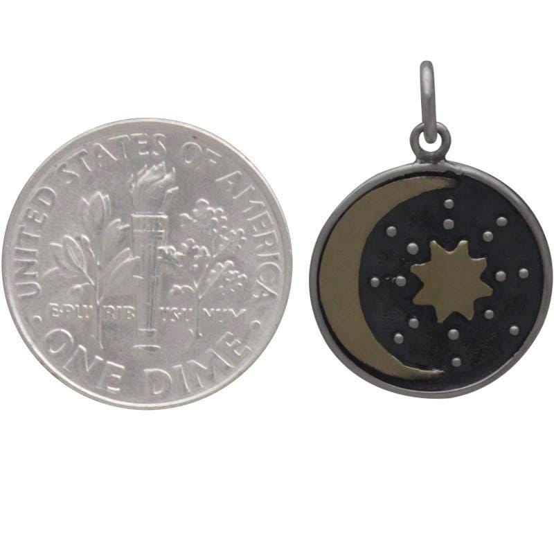 This handmade, mixed metal celestial pendant features black oxidation to create the night sky as a beautiful backdrop for the sunburst surrounded by sterling silver granulated dots and the bronze crescent moon.