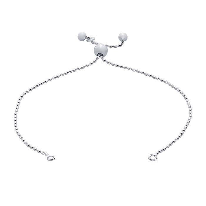 This sterling silver 1.2mm bead chain bracelet component is open at the center with a closed ring at each chain end (.063" ID). Complete the bracelet with a link component, an engravable plaque, or a short length of strung beads. The bracelet is fully adjustable using a movable round coin-shaped silicone-lined bead (6mm) that slides along the chain. Two round drops finish the chain and serve as a stop to keep the slider bead from slipping off the chain.