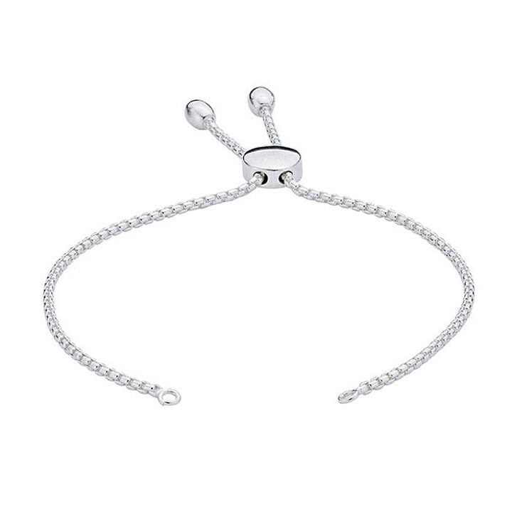 This sterling silver rounded box chain bracelet component is open at the center with a .072" ID ring at each open end; complete the bracelet with a link component, an engravable plaque, or a short length of strung or wire-wrapped beads. The bracelet is fully adjustable using a movable coin-shaped silicone-lined bead (9.4 x 5mm) that slides along the chain. Two oval drops (6 x 3mm, approx.) finish the chain and serve as a stop to keep the slider bead from slipping off the chain.