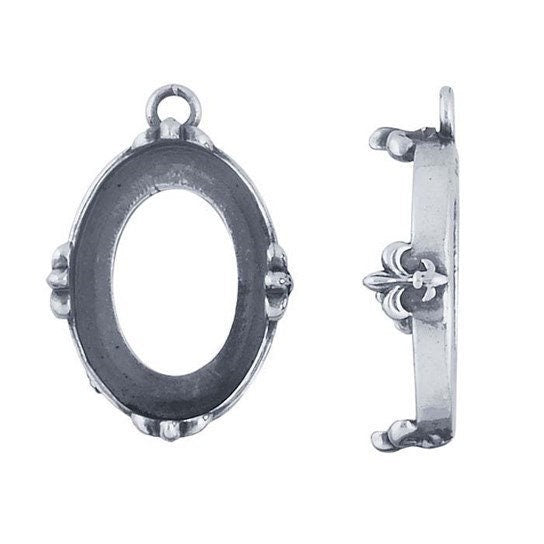 This sterling silver component mounting features four fleur-de-lis that act as prongs to hold one 18 x 13mm oval cabochon or other flat-back stone. Use the component as an earring drop, a delicate pendant, or as one element in more complex necklace and bracelet designs. Set your stone in the mounting, then push the prongs over the stone to secure it in place. The component is oxidized to highlight the details.