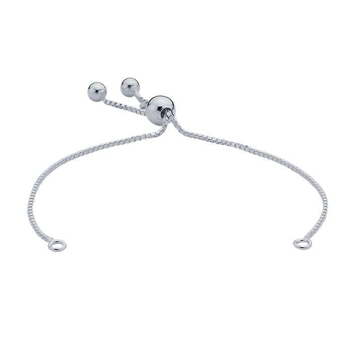 This sterling silver 1mm box chain bracelet is open at the center and has a ring (.072" ID) at the open ends of the chain; complete the bracelet with a link component, engravable plaque or a short length of strung or wire-wrapped beads. The bracelet is fully adjustable using the silicone-lined round bead (6mm) that slides along the chain, yet holds its position where you place it. Two round end drops (4mm) finish the chain and serve as a stop to keep the bead from slipping off the chain. The bracelet is plated with fine silver to provide a bright, tarnish-resistant finish