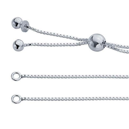This sterling silver box chain necklace component is open at the center with a closed ring at each open end (.063" ID); complete the necklace with a festoon component, an engravable plaque, or a short length of strung beads. The necklace is fully adjustable using a movable round silicone-lined bead (6mm) that slides along the chain. Two round drops finish the chain and serve as a stop to keep the slider bead from slipping off the chain.