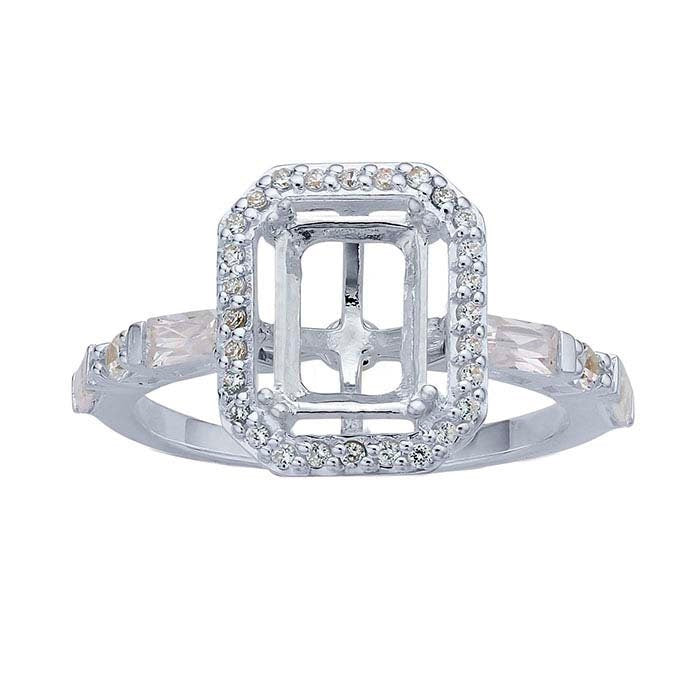 This sterling silver ring mounting is semi-mounted with 28 round CZs in shared 4-prong mountings in a halo around the center mounting, and six CZs on the decorative sides of the ring shank—two baguettes and one round CZ on each side. The 4-prong center mounting holds one 8 x 6mm octagon faceted stone. Cut a seat in the mounting to accommodate your stone, then burnish the prongs over the stone to secure it in place.