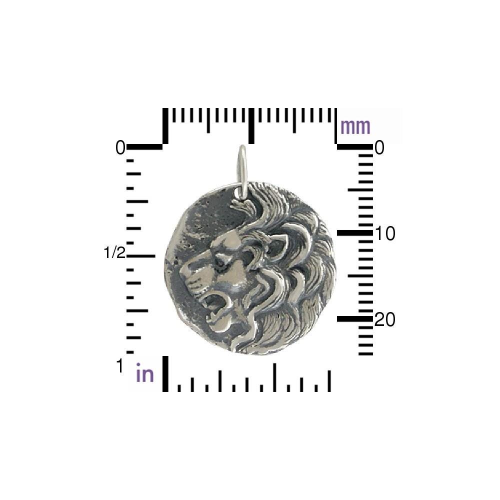 Sterling Silver Ancient Coin Charm with Lion Head. Symbolic meanings of lions revolve around strength, leadership, and protection. Viewed as symbols of royalty, they are often depicted as an emblem of sovereigns, and as guardians of palaces, doorways, shrines, and thrones.
