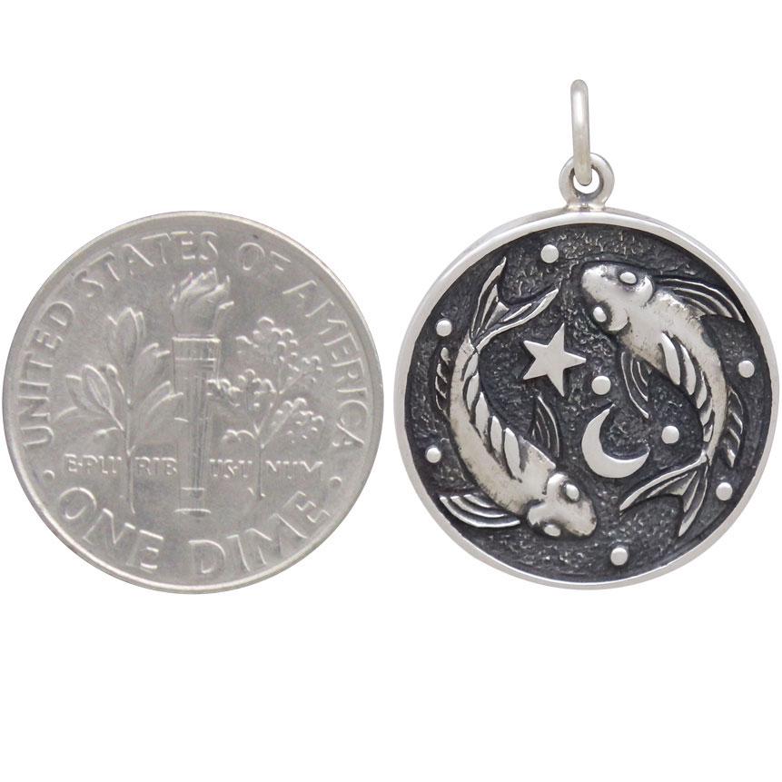 Sterling Silver Astrology Pisces Pendant. Celebrate imaginative Pisces with this coin charm depicting the ethereal fish. The reverse side denotes their ruling planet: Neptune.