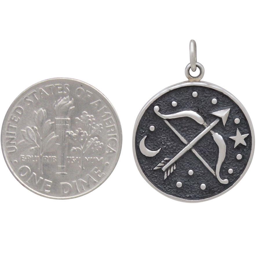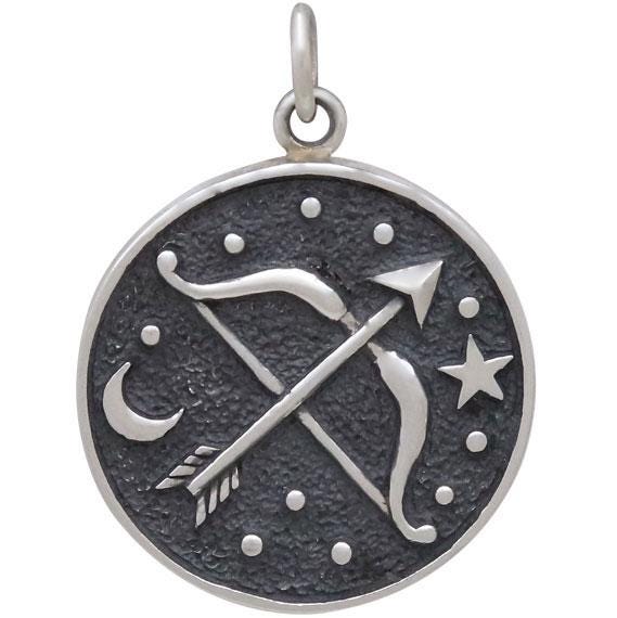 Sterling Silver Astrology Sagittarius Pendant. Celebrate exuberant Sagitarrius with this coin charm emblazoned with the Archer's bow & arrow. The reverse side denotes their ruling planet: Jupiter.