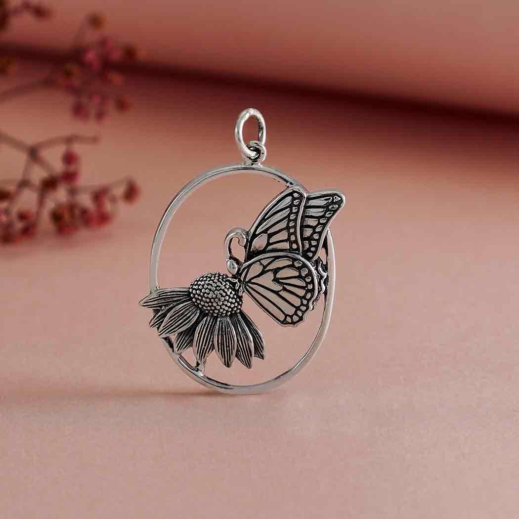 This sterling silver butterfly on flower pendant captures the delicate beauty of nature in stunning detail. The open oval frame encloses a lifelike butterfly resting on a blooming flower, symbolizing transformation, grace, and the fleeting moments of life. The intricate design features finely textured wings and detailed flower petals, giving the pendant an elegant, three-dimensional appearance. The contrast between light and dark oxidized areas enhances the depth of the design. A sweet offering in your shop for Easter, Springtime Celebrations, and wedding season. Find all in the Bug Charms Collection.