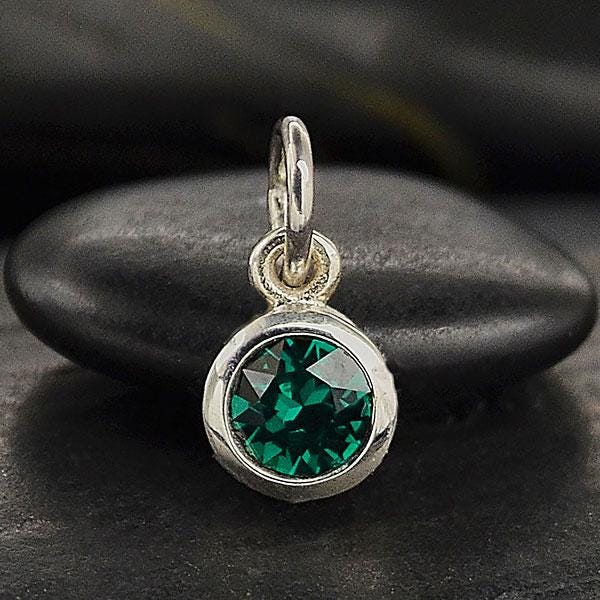 This sterling silver birthstone charm features an emerald colored crystal. Birthstone charms are great for celebrating loved ones. These charms are perfect for new mommies, grandmas, sisters, or any special person in your life!