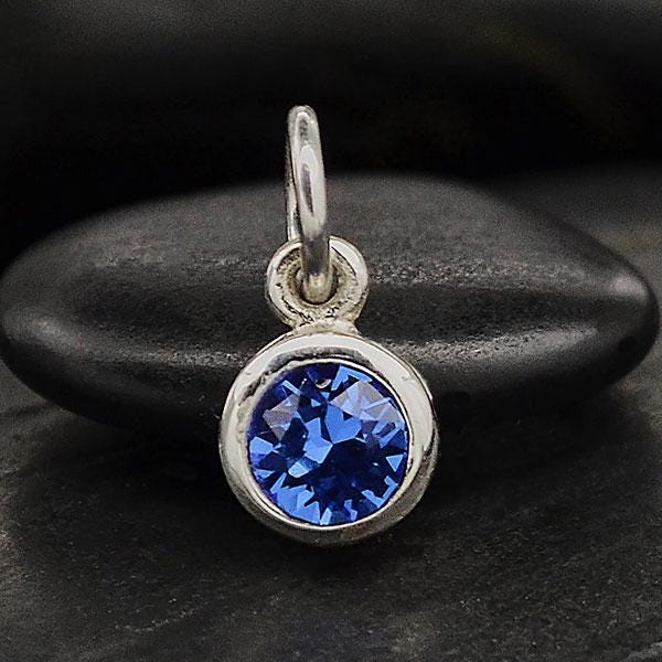 This sterling silver birthstone charm features a sapphire colored crystal. Birthstone charms are great for celebrating loved ones. These charms are perfect for new mommies, grandmas, sisters, or any special person in your life!