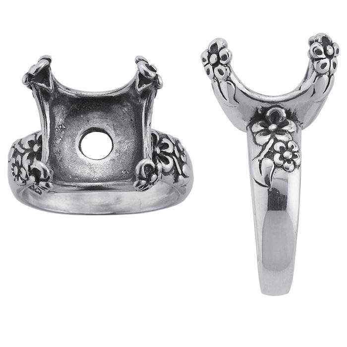 This sterling silver ring mounting features a slightly tapered band and an intricate floral pattern on both the shank and the prongs. The pre-notched 4-prong mounting holds one 14mm (approx.) cushion-cut faceted stone. The ring is oxidized to enhance the details. Set your stone into the prongs to check the fit. If necessary, adjust the seat to best accommodate your stone. To secure the stone in place, burnish the prongs over the stone.
