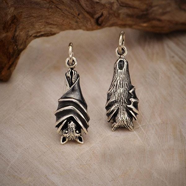 Sterling Silver Hanging Bat Charm. With her wings wrapped around herself like a cloak, this little bat is taking a long deserved rest. This bat charm is lovely from all sides - the ribbed wings wrap from front to back, and she has a sweet face with a long nose and pointy ears.