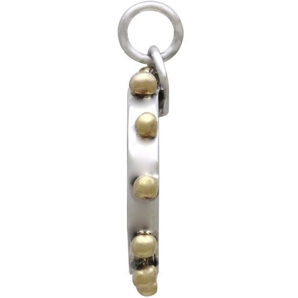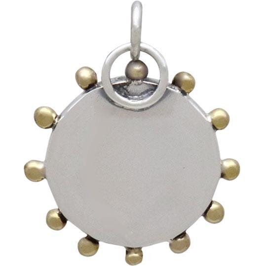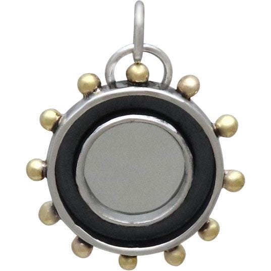 This sterling silver shadow box styled mirror charm features bronze granulation. There's a real mirror at the center of the design, and bronze dots along the edge of the darkened, oxidized shadow box frame. The overall effect is moody, dramatic, and stormy.