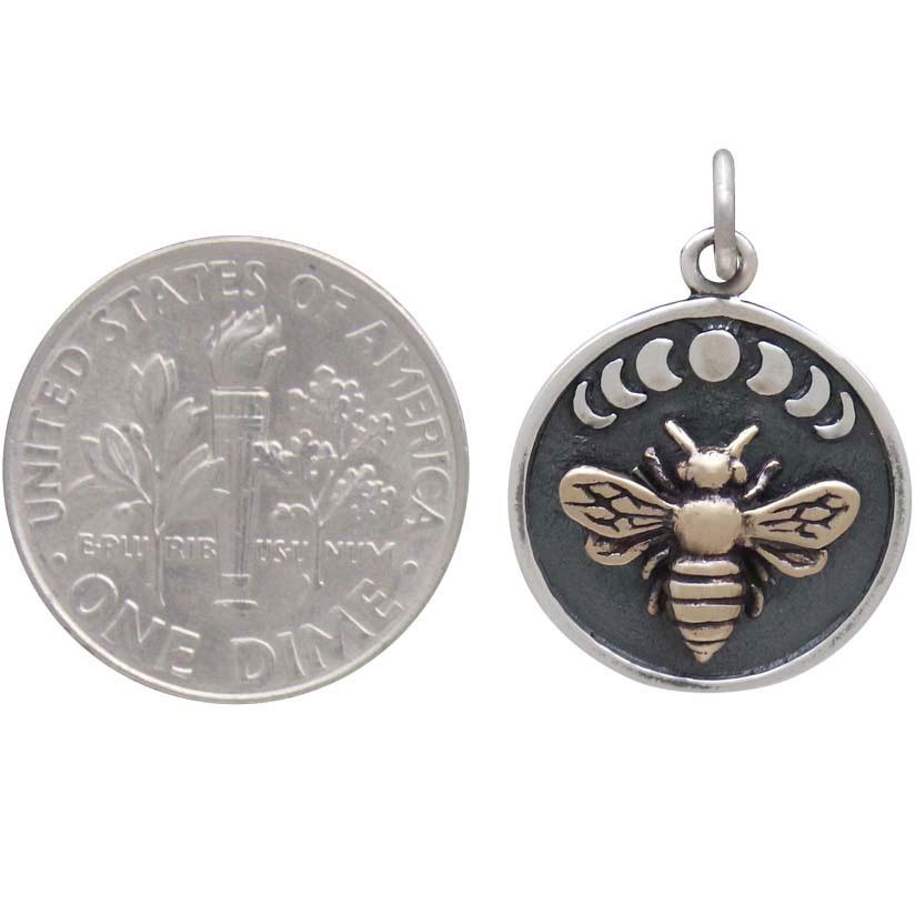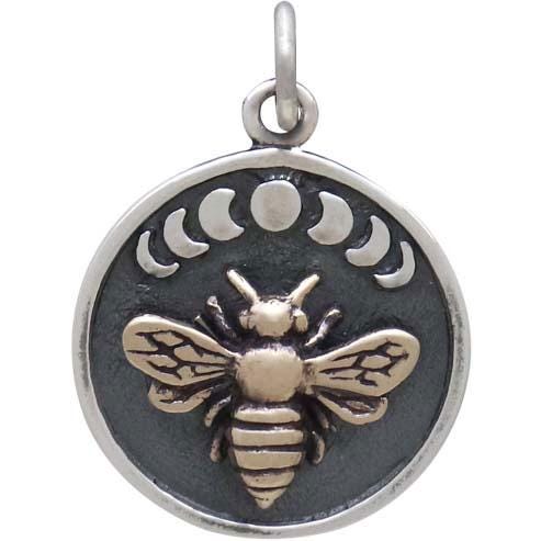 This sterling silver moon phase charm with bronze bee is all about contrasts. Not only does the bronze bee stand in stark contrast to the darkly oxidized background and shiny moons, but honey bees are usually associated with sun light. But here we highlight the moon's power to effect even the daytime activities of busy bees. All hail the moon.