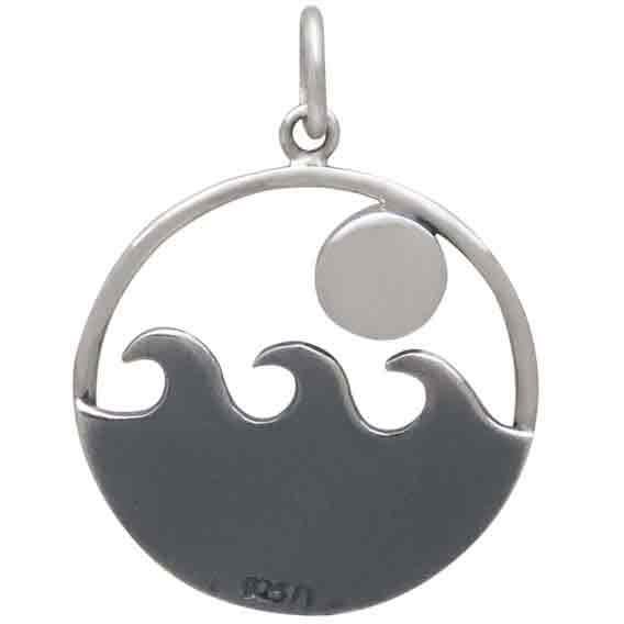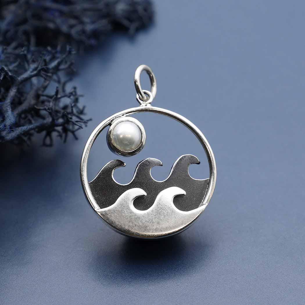 Framed within this sterling silver ocean pendant with pearl moon is a vast watery realm, churning to and fro from the moon's influence. Many mystics say the heart is all encompassing, like a great ocean. When we feel overcome with feelings, we often say we are swimming in a sea of emotions. In this beautifully rendered and oxidized wave pendant, the pearl moon and the ocean waves together represent the unknown, the deep subconscious, the spiritual, and the feminine element. Handmade in Bali.