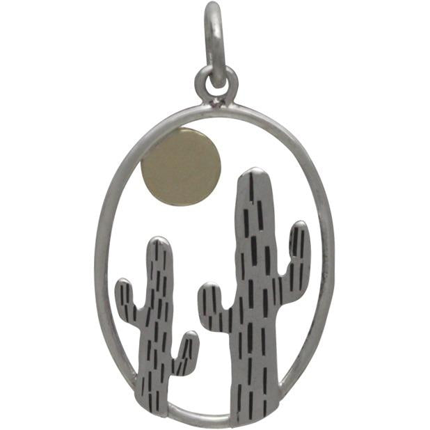 Sterling Silver Oval Cactus Pendant with Bronze Sun 27x15mm