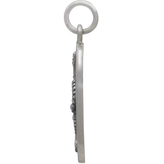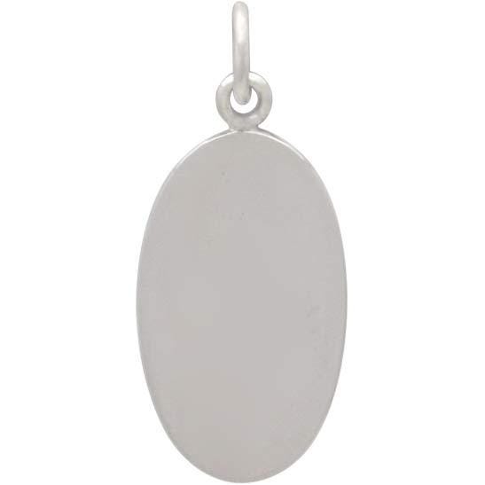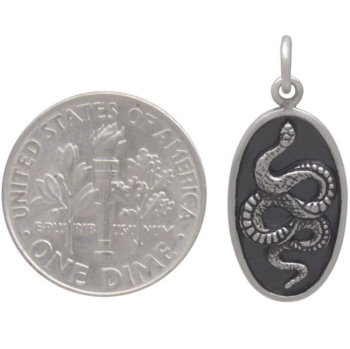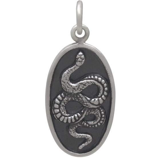 Sterling silver snake pendant on oval disk. A tiny, slithering snake makes it way up a darkened, framed oval disk to add instant Gothic appeal to your jewelry line. Snakes are beguiling creatures saturated with symbolic meaning. Because they shed their skin & move so quickly, they've come to signify rebirth, transformation, duality, and thought of as protectors of the shadow realms & portals between worlds.