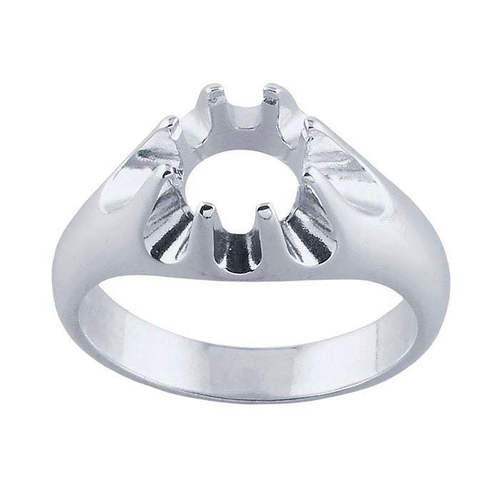 This sterling silver ring features a classic, tapered shape and eight pre-notched prongs with a sweeping scalloped design. The mounting holds 10mm (approx.) round faceted stone. Set your stone into the prongs to check the fit. If necessary, adjust the seat to best accommodate your stone. To secure the stone in place, burnish the prongs over the stone.