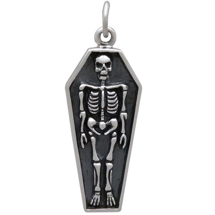 Wear this sterling silver skeleton charm in coffin not only for Halloween spirit, but also as a reminder to live every day as if it's your last. Centuries ago beautiful jewelry was created to remind people of their own mortality. Referred to as Memento Mori - meaning "remember you must die" - this jewelry served as a warning to prepare ourselves for whatever other realm awaits us. Memento Mori were often decorated with skeletons in coffins mounted on rings, and engraved with phrases such as "life is fleeting."