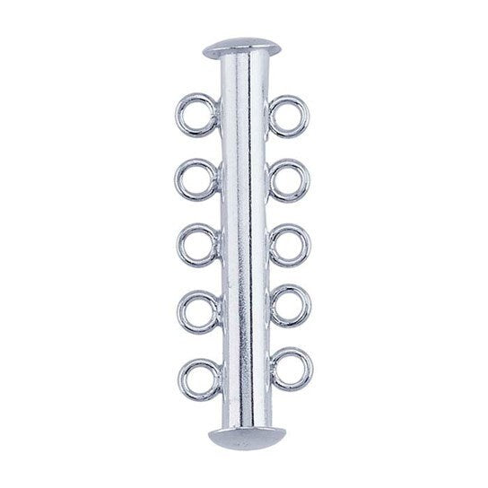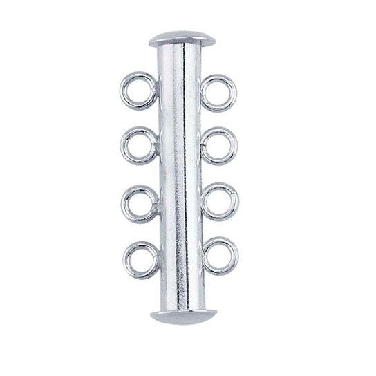 This sterling silver tube slide clasp accommodates strands is easy to open and close and has a tight, strong fit that is ideal for holding heavy or multiple necklace or bracelet strands securely. This clasp features a wide gap between strands, allowing room for larger beads. Use tie or crimp strands onto the attached rings. A slide, or slide tube, clasp is ideal for multi-strand necklaces and bead strands. This style is available and configured to hold two to ten or more strands. Because the two tube parts slide together longwise but lie sideways on the wearer, the weight of the necklace provides the tension that helps keep the clasp securely closed. In addition, because it lies sideways, it helps keep the strands separated for a beautiful—and untangled—presentation.