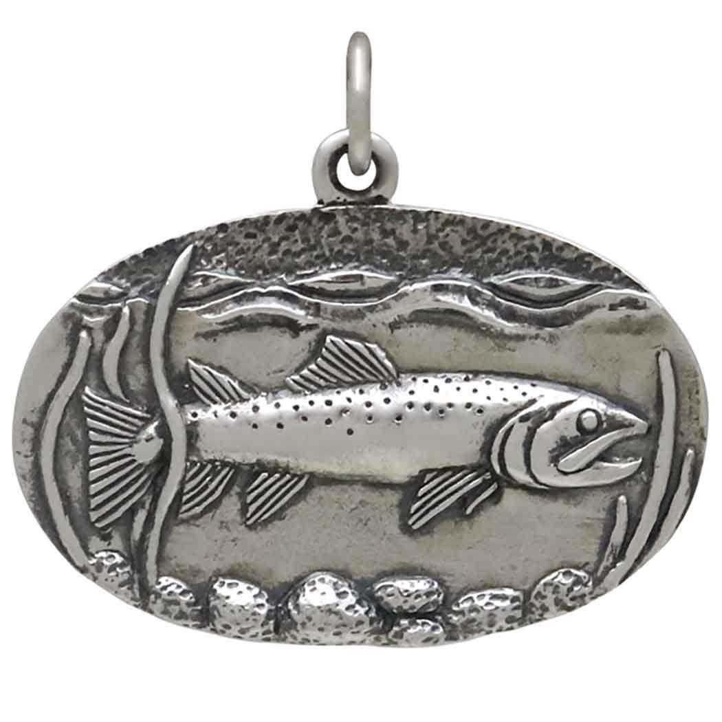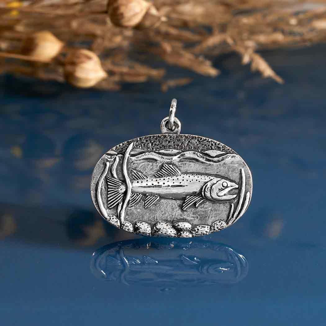 Dive into the serene beauty of nature with the Sterling Silver Trout in Stream Pendant.This charm captures the tranquil scene of a trout swimming gracefully through a stream, surrounded by delicate aquatic plants and pebbles, bringing the underwater world to life.Ideal for nature lovers and fishing enthusiasts.