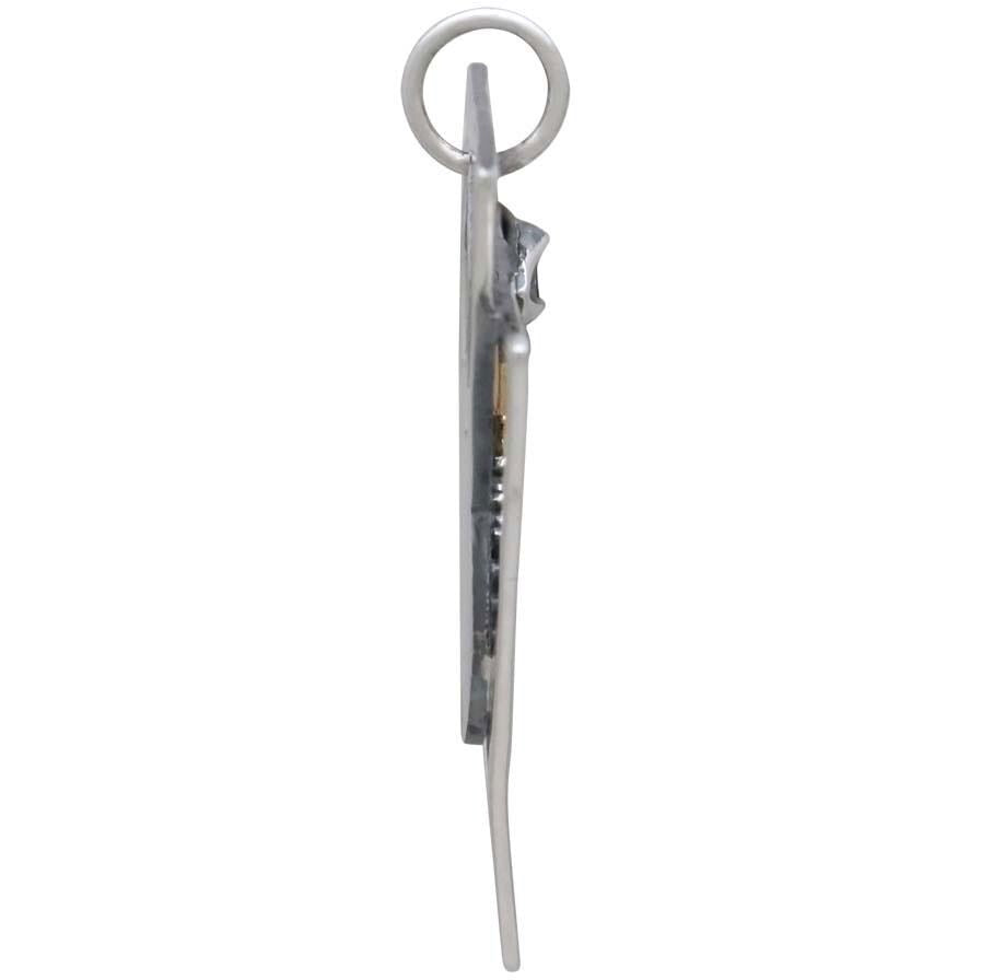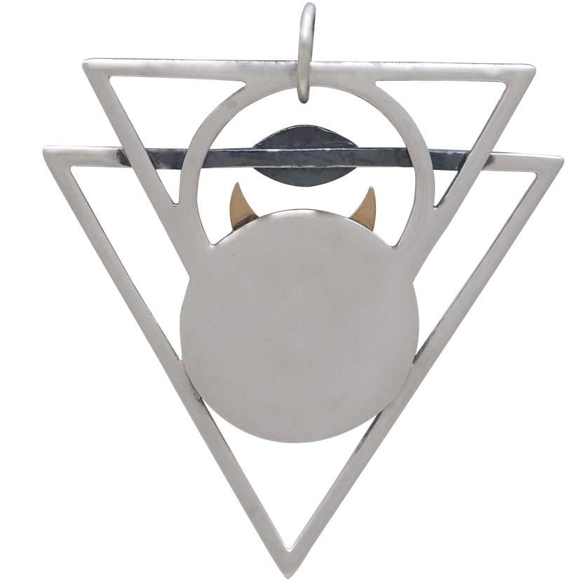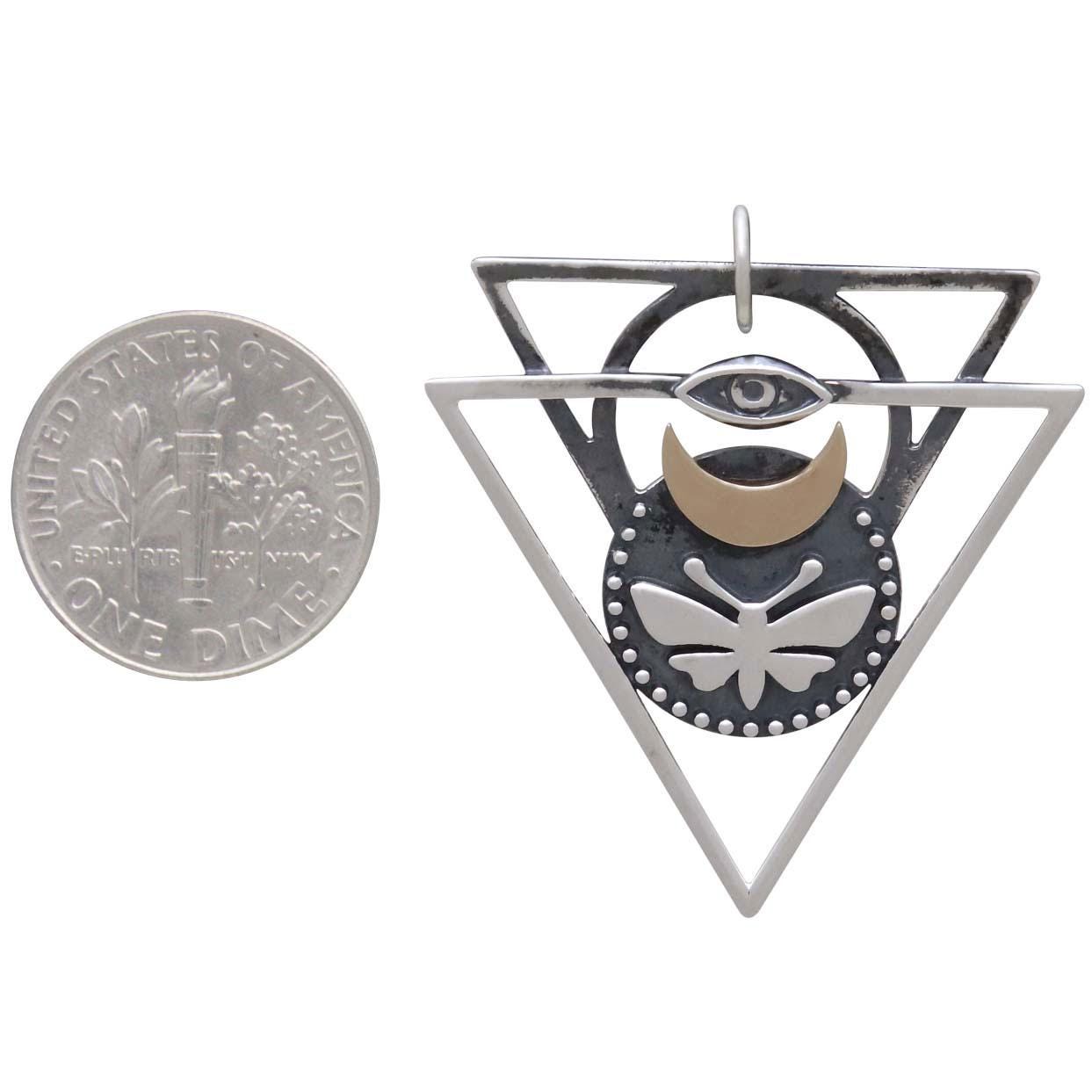 Offer your customers symbolic jewelry when you list this mixed metal triangle pendant with moth and eye. The moth and inverted crescent moon signify change as a natural part of life, and honors these ongoing cycles of transformation as a form of beauty in itself, while the eye at the top offers protection from negative energy flows.