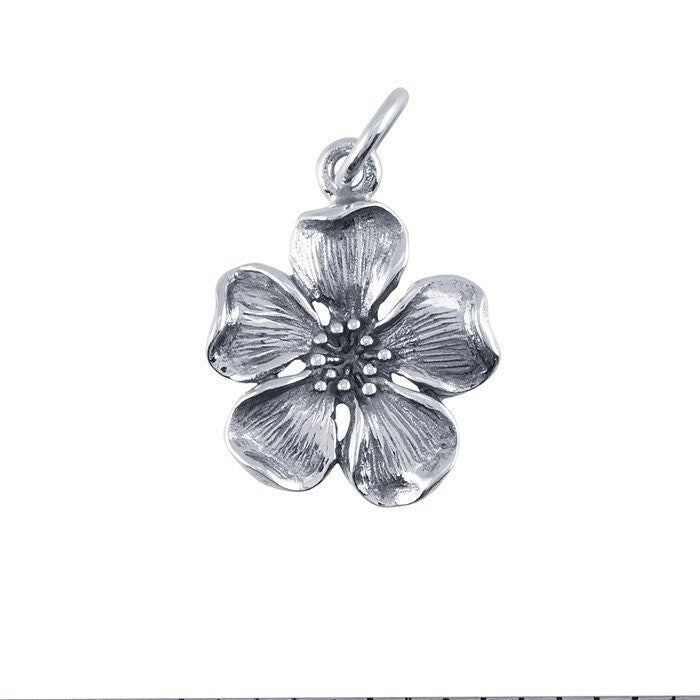 Sterling Silver Cherry Blossom Charm. A delicate and wonderfully detailed charm, this cherry blossom will be sure to add sweetness to any jewelry piece. A representation of love in Chinese herbology, the cherry blossom is always given as a gift to loved ones.