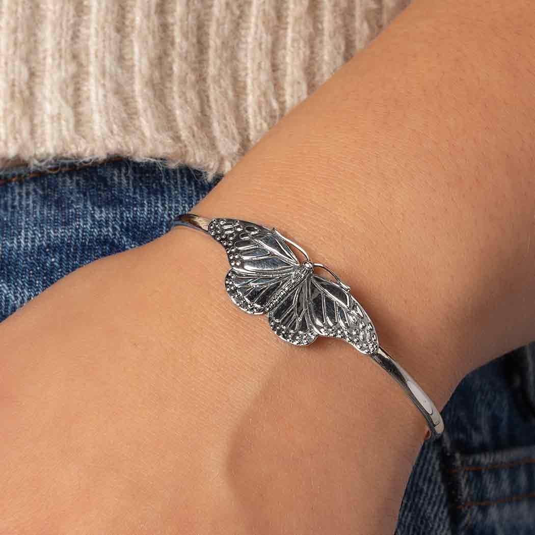 Wear this sterling silver monarch butterfly cuff bracelet to honor the queen of butterflies, symbolizing beauty, strength, endurance, trust and evolution. We marvel at her grace as she flutters by. understanding she's at the end of a miraculous migrational journey. We celebrate the monarch's arrival, and ponder how she's at her most beautiful later in life. This butterfly bracelet delights with its gently curved wings, delicate texturing, and long antennae. Find more Bracelets to add to your shop and more Finished Jewelry to round out your collection.