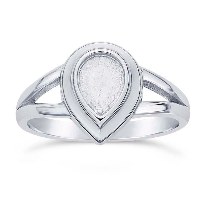This sterling silver ring mounting features a split-shank design and a glue-in bezel setting that accommodates one pear-shaped cabochon. Use jeweler's epoxy to secure your stone into the bezel.